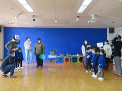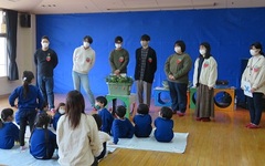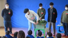 いちごの栽培と研究を目的としたグループ「いちごちやん」(1・2年生7名)が、自分たちが栽培したいちごを使った食育活動を行うため、3月3日に地元の羽曳野市立西浦幼稚園を訪問しました。いちごを植え付けたプランターを使った説明や自分たちで考えた楽しいクイズを行い、目をキラキラさせた子どもたちからの質問にわかりやすく答えるなど、自分たちで伝える大切さを学びました。